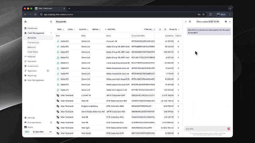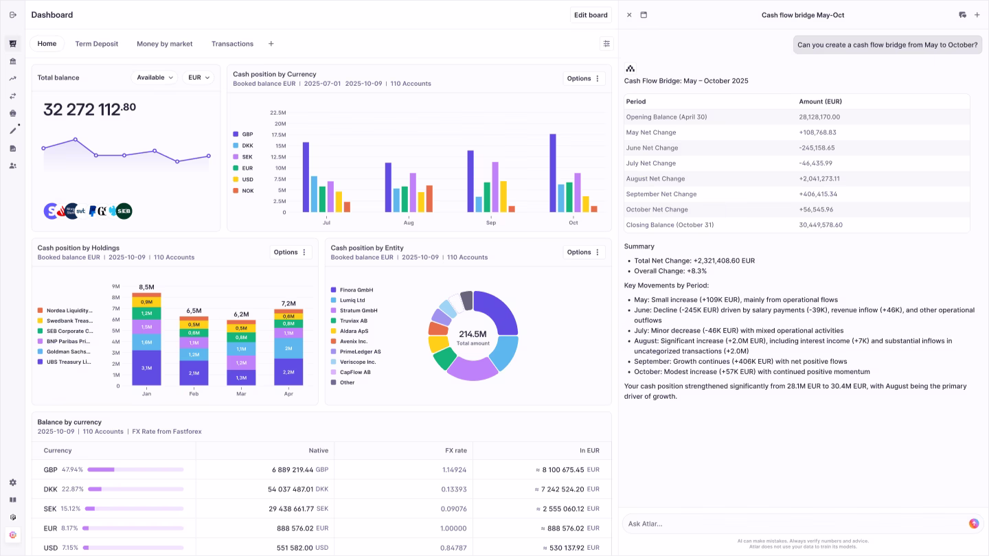 With a single prompt, you can ask Atlar to explain your balances, build a cash flow bridge, or spot unusual outflows. Our new AI assistant makes treasury data as easy to query as a conversation.