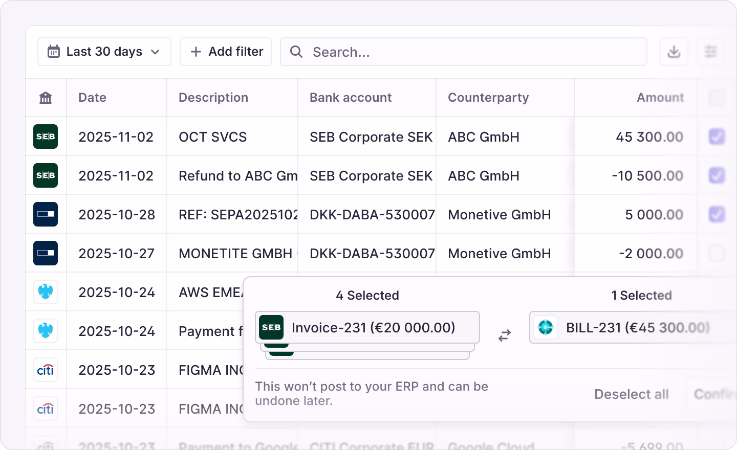 Integrations with NetSuite, Microsoft Dynamics 365, and SAP S/4HANA mean that matched transactions sync bidirectionally. Once approved by the user, matches can post automatically. Journal entries can be created when no corresponding accounting record exists.