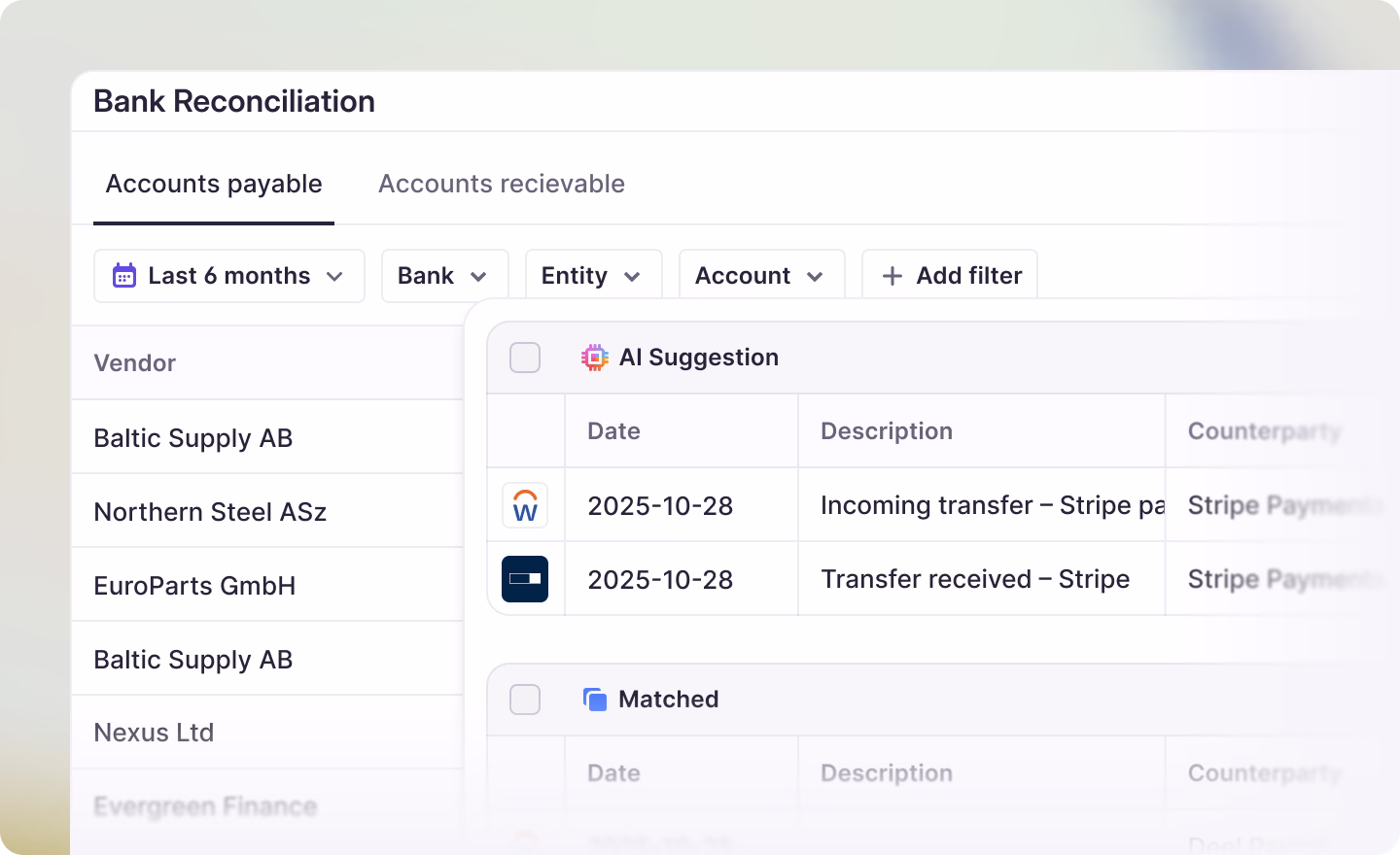 Atlar matches bank records to ERP entries using a combination of rules and AI that adapts to your transaction patterns. It catches what static rules miss: partial payments, payer name variations, bank fee discrepancies. Matches sync back to SAP bidirectionally, and unmatched records can generate journal entries automatically. The reconciliation agent goes further, proposing new matching rules based on what it observes.